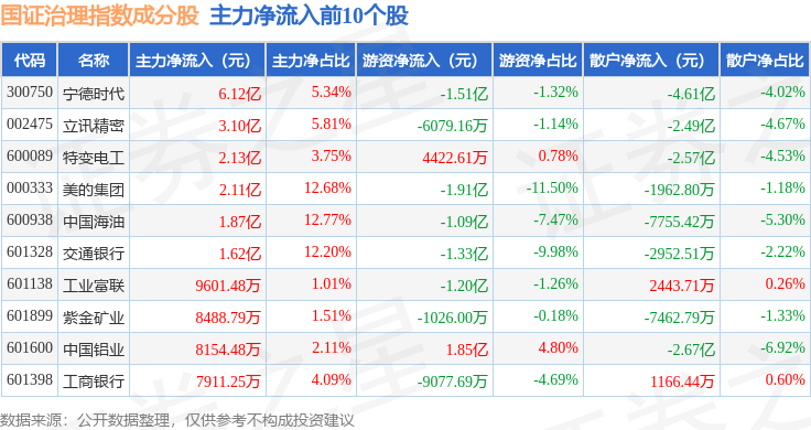 资金流向方面,国证治理(399322)指数成份股当日主力资金净流出合计5.87亿元,游资资金净流出合计1.45亿元,散户资金净流入合计7.32亿元。成份股资金流向详情见下表: