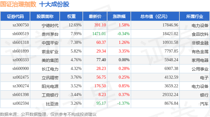 证券之星消息,11月19日,国证治理(399322)指数报收于10439.78点,涨0.65%,成交979.98亿元,换手率0.32%。当日该指数成份股中,上涨的有34家,紫金矿业以3.35%的涨幅领涨,下跌的有15家,晶盛机电以3.34%的跌幅领跌。