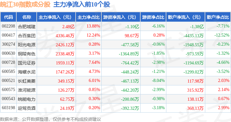 资金流向方面,皖江30(399350)指数成份股当日主力资金净流出合计7.46亿元,游资资金净流入合计193.82万元,散户资金净流入合计7.44亿元。成份股资金流向详情见下表: