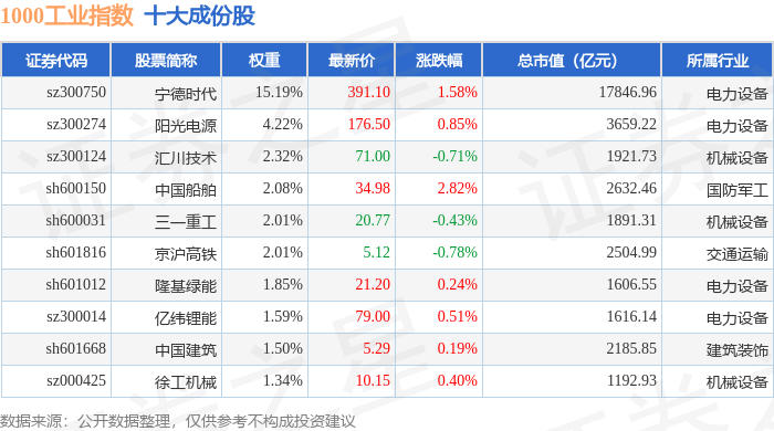 1000工业(399383)指数十大成份股详情如下: