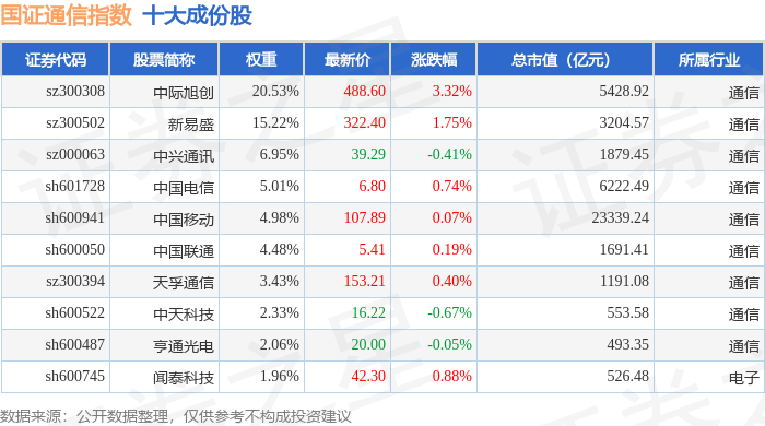 国证通信(399389)指数十大成份股详情如下: