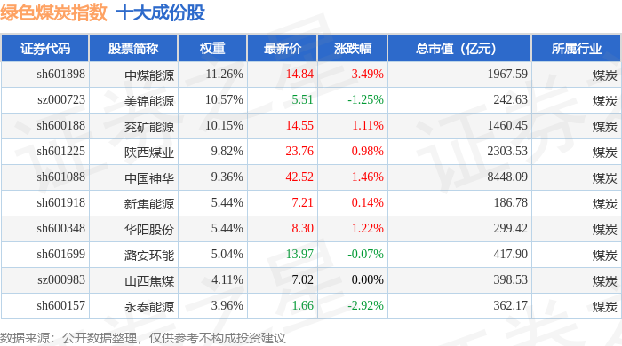 证券之星消息,11月19日,绿色煤炭(399436)指数报收于4217.55点,涨0.49%,成交79.72亿元,换手率1.57%。当日该指数成份股中,上涨的有11家,中煤能源以3.49%的涨幅领涨,下跌的有12家,郑州煤电以6.1%的跌幅领跌。