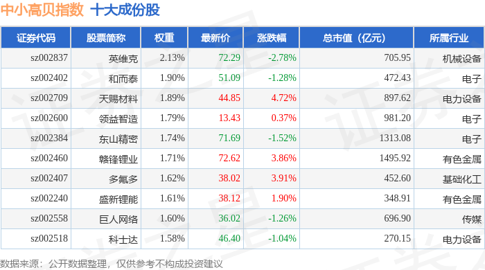 证券之星消息,11月19日,中小高贝(399664)指数报收于1460.94点,跌0.46%,成交1097.99亿元,换手率3.44%。当日该指数成份股中,上涨的有22家,融捷股份以10.0%的涨幅领涨,下跌的有76家,利欧股份以5.11%的跌幅领跌。