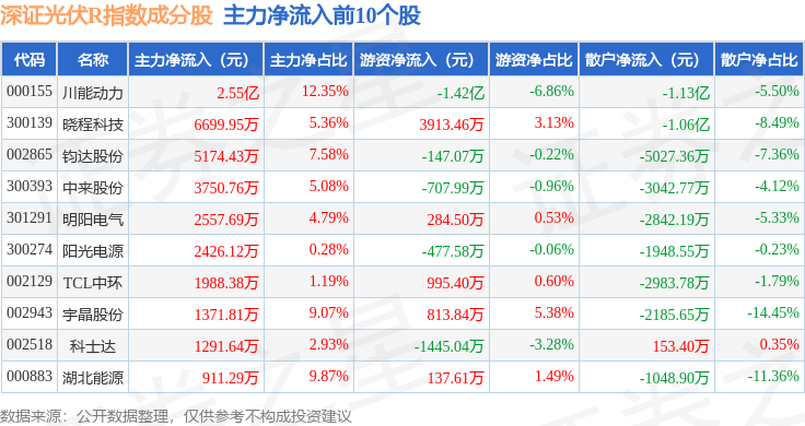 资金流向方面,深证光伏R(470035)指数成份股当日主力资金净流出合计13.3亿元,游资资金净流入合计1.63亿元,散户资金净流入合计11.68亿元。成份股资金流向详情见下表: