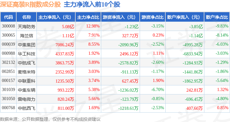 资金流向方面,深证高装R(470037)指数成份股当日主力资金净流出合计7.92亿元,游资资金净流入合计1.93亿元,散户资金净流入合计5.98亿元。成份股资金流向详情见下表: