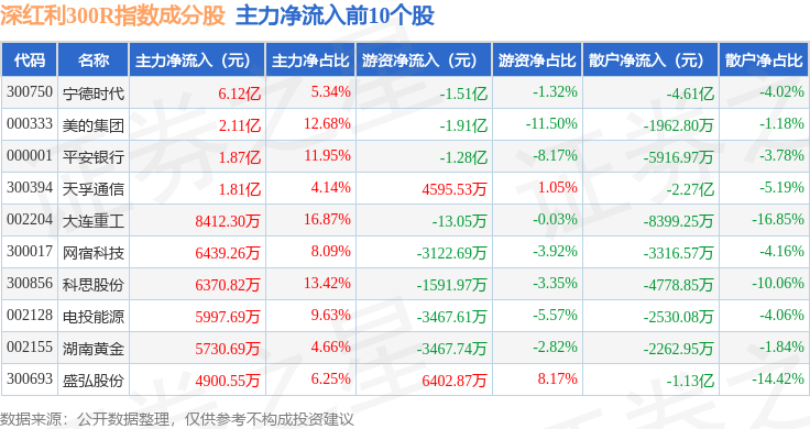 资金流向方面,深红利300R(470062)指数成份股当日主力资金净流出合计37.34亿元,游资资金净流入合计6.26亿元,散户资金净流入合计31.08亿元。成份股资金流向详情见下表: