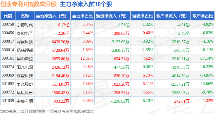 资金流向方面,创业专利R(470068)指数成份股当日主力资金净流出合计9.58亿元,游资资金净流入合计2.47亿元,散户资金净流入合计7.11亿元。成份股资金流向详情见下表: