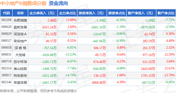资金流向方面,中小地产R(471002)指数成份股当日主力资金净流入合计2.25亿元,游资资金净流出合计1.08亿元,散户资金净流出合计1.18亿元。成份股资金流向详情见下表: