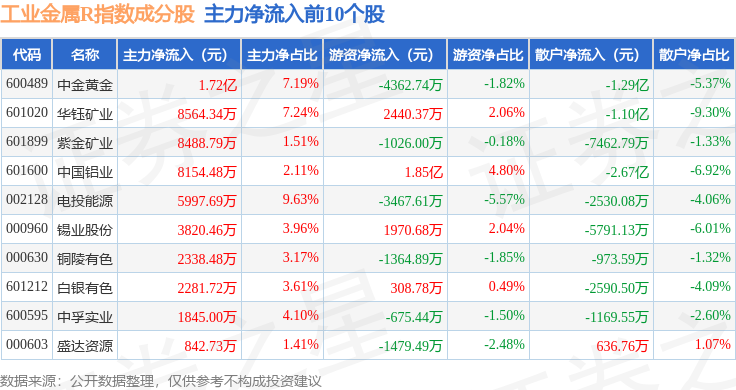 资金流向方面,工业金属R(480043)指数成份股当日主力资金净流出合计4.61亿元,游资资金净流入合计2.34亿元,散户资金净流入合计2.27亿元。成份股资金流向详情见下表: