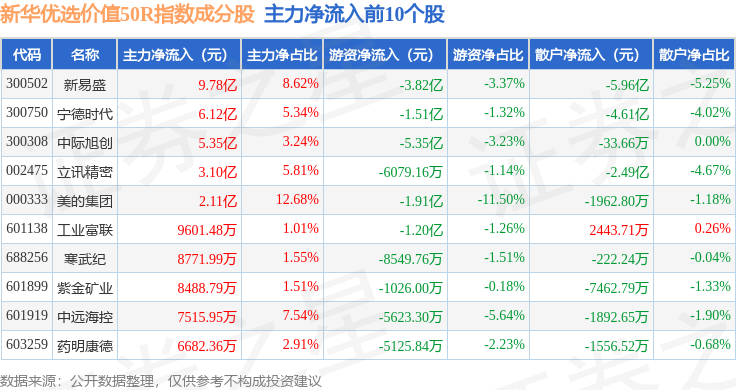 资金流向方面,新华优选价值50R(489004)指数成份股当日主力资金净流出合计5.03亿元,游资资金净流出合计9.57亿元,散户资金净流入合计14.6亿元。成份股资金流向详情见下表: