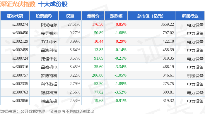 深证光伏(970035)指数十大成份股详情如下: