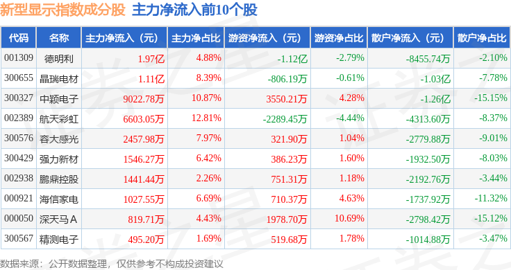 资金流向方面,新型显示(970048)指数成份股当日主力资金净流出合计13.77亿元,游资资金净流入合计1.43亿元,散户资金净流入合计12.35亿元。成份股资金流向详情见下表: