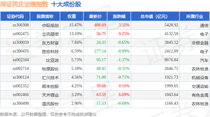 证券之星消息,11月19日,深证民企治理(970058)指数报收于1936.89点,涨0.47%,成交888.19亿元,换手率1.45%。当日该指数成份股中,上涨的有19家,天齐锂业以6.09%的涨幅领涨,下跌的有31家,锦浪科技以3.52%的跌幅领跌。