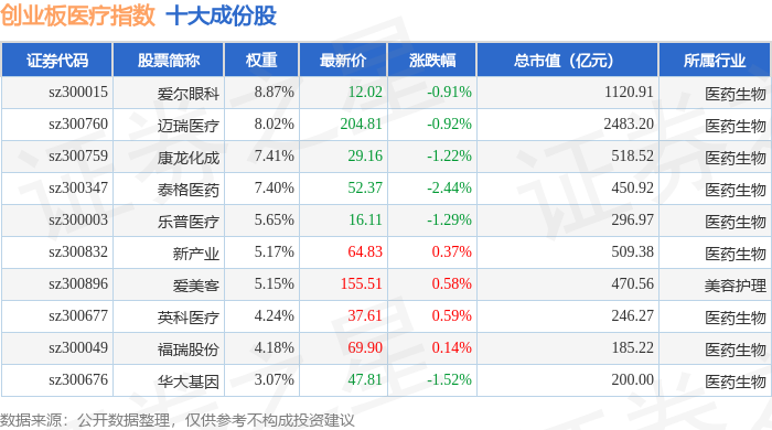 证券之星消息,11月19日,创业板医疗(970082)指数报收于3769.68点,跌1.15%,成交97.99亿元,换手率1.32%。当日该指数成份股中,上涨的有7家,中红医疗以10.39%的涨幅领涨,下跌的有43家,金凯生科以4.07%的跌幅领跌。