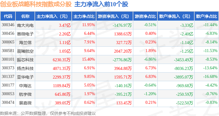 资金流向方面,创业板战略科技(971004)指数成份股当日主力资金净流出合计6.82亿元,游资资金净流入合计4.22亿元,散户资金净流入合计2.59亿元。成份股资金流向详情见下表: