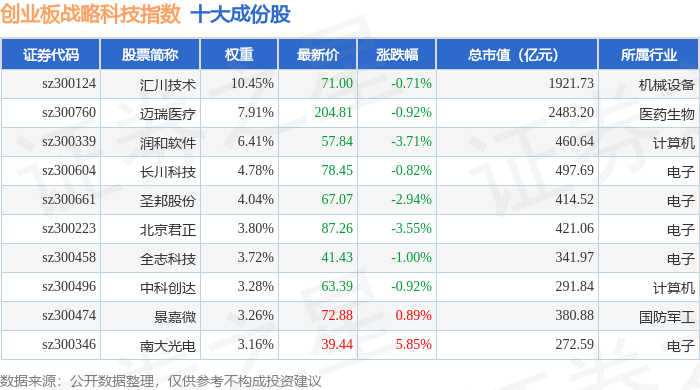 证券之星消息,11月19日,创业板战略科技(971004)指数报收于6126.01点,跌0.74%,成交285.42亿元,换手率3.62%。当日该指数成份股中,上涨的有12家,赛微电子以10.16%的涨幅领涨,下跌的有38家,金凯生科以4.07%的跌幅领跌。