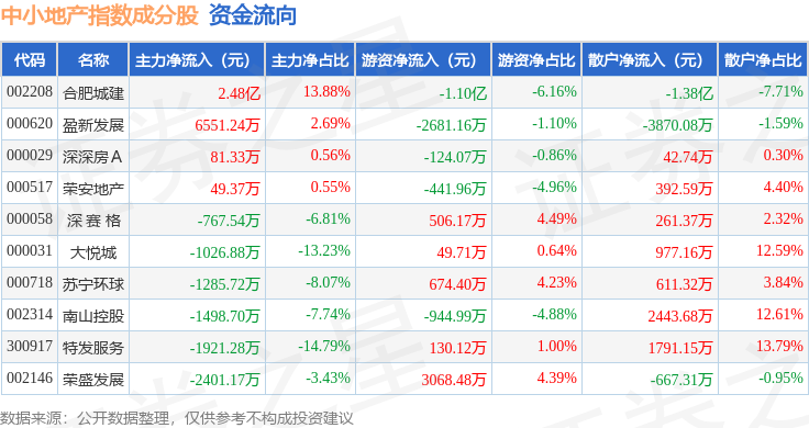 资金流向方面,中小地产(971002)指数成份股当日主力资金净流入合计2.25亿元,游资资金净流出合计1.08亿元,散户资金净流出合计1.18亿元。成份股资金流向详情见下表:
