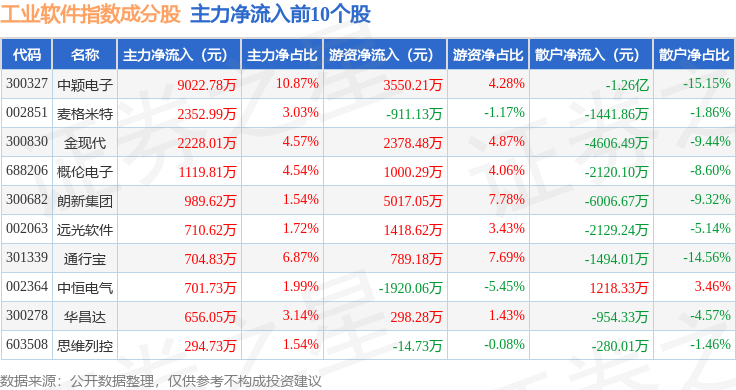 资金流向方面,工业软件(980034)指数成份股当日主力资金净流出合计12.26亿元,游资资金净流入合计3.91亿元,散户资金净流入合计8.35亿元。成份股资金流向详情见下表: