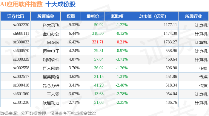 资金流向方面,AI应用软件(980107)指数成份股当日主力资金净流出合计32.83亿元,游资资金净流入合计9.68亿元,散户资金净流入合计23.15亿元。成份股资金流向详情见下表: