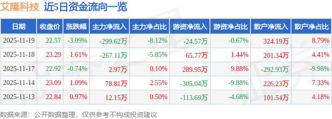 证券之星消息,截至2025年11月19日收盘,艾隆科技(688329)报收于22.57元,下跌3.09%,换手率2.09%,成交量1.61万手,成交额3688.78万元。