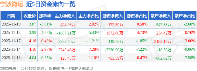 证券之星消息,截至2025年11月19日收盘,宁波海运(600798)报收于3.87元,下跌3.01%,换手率4.48%,成交量54.07万手,成交额2.1亿元。