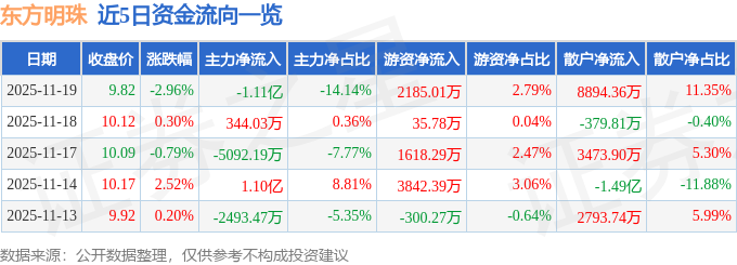 证券之星消息,截至2025年11月19日收盘,东方明珠(600637)报收于9.82元,下跌2.96%,换手率2.36%,成交量79.19万手,成交额7.84亿元。