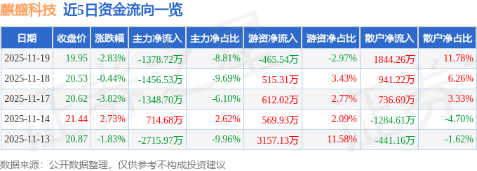 证券之星消息,截至2025年11月19日收盘,麒盛科技(603610)报收于19.95元,下跌2.83%,换手率2.2%,成交量7.76万手,成交额1.57亿元。