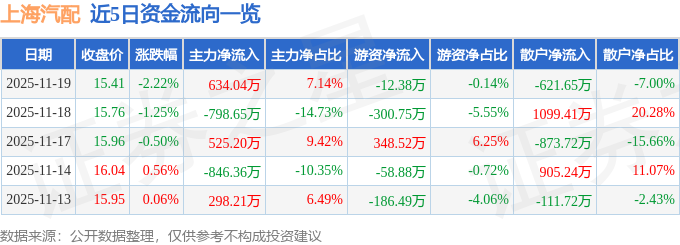 证券之星消息,截至2025年11月19日收盘,上海汽配(603107)报收于15.41元,下跌2.22%,换手率2.63%,成交量5.73万手,成交额8879.77万元。