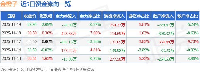 证券之星消息,截至2025年11月19日收盘,金橙子(688291)报收于29.95元,下跌2.09%,换手率1.41%,成交量1.45万手,成交额4380.55万元。