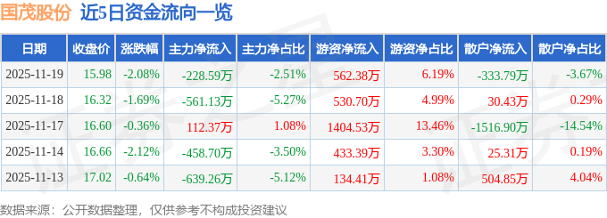 证券之星消息,截至2025年11月19日收盘,国茂股份(603915)报收于15.98元,下跌2.08%,换手率0.86%,成交量5.63万手,成交额9091.8万元。