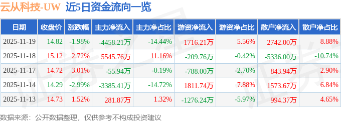证券之星消息,截至2025年11月19日收盘,云从科技(688327)报收于14.82元,下跌1.98%,换手率2.49%,成交量20.77万手,成交额3.09亿元。