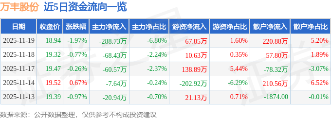 证券之星消息,截至2025年11月19日收盘,万丰股份(603172)报收于18.94元,下跌1.97%,换手率4.48%,成交量2.24万手,成交额4248.02万元。