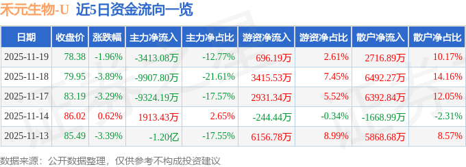 证券之星消息,截至2025年11月19日收盘,禾元生物(688765)报收于78.38元,下跌1.96%,换手率8.28%,成交量3.39万手,成交额2.67亿元。