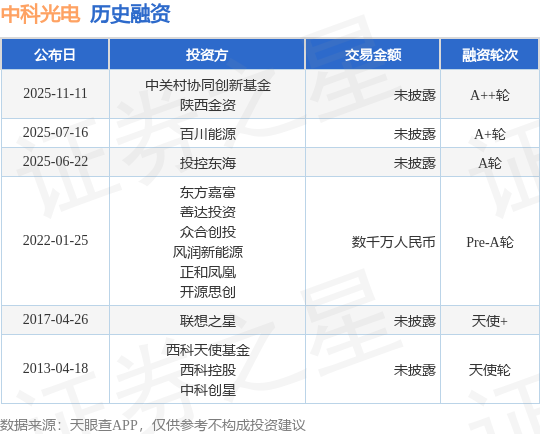 证券之星消息,根据天眼查APP于11月11日公布的信息整理,西安中科光电精密工程有限公司A++轮融资,融资额未披露,参与投资的机构包括中关村协同创新基金,陕西金资。