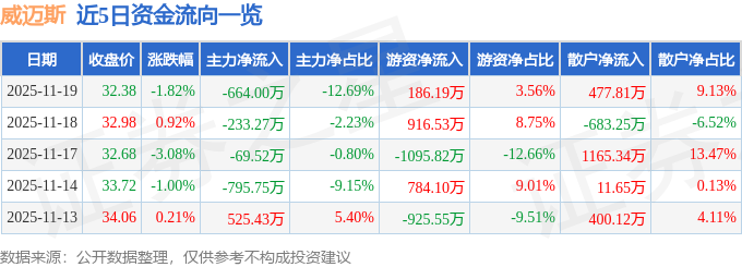 证券之星消息,截至2025年11月19日收盘,威迈斯(688612)报收于32.38元,下跌1.82%,换手率0.63%,成交量1.6万手,成交额5234.09万元。