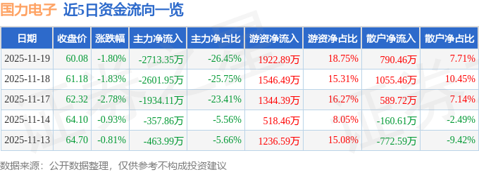 证券之星消息,截至2025年11月19日收盘,国力电子(688103)报收于60.08元,下跌1.8%,换手率1.78%,成交量1.7万手,成交额1.03亿元。