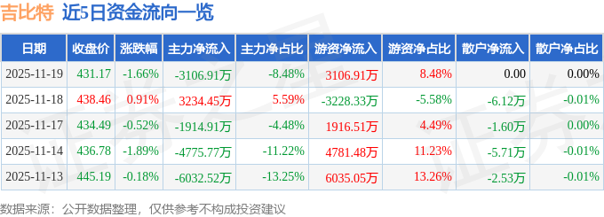 11月19日的资金流向数据方面,主力资金净流出3106.91万元,占总成交额8.48%,游资资金净流入3106.91万元,占总成交额8.48%,无散户资金净流入。