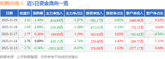 证券之星消息,截至2025年11月19日收盘,和辉光电(688538)报收于2.65元,下跌1.49%,换手率0.99%,成交量56.97万手,成交额1.52亿元。