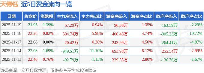 证券之星消息,截至2025年11月19日收盘,天德钰(688252)报收于21.95元,下跌1.39%,换手率1.78%,成交量3.25万手,成交额7142.34万元。