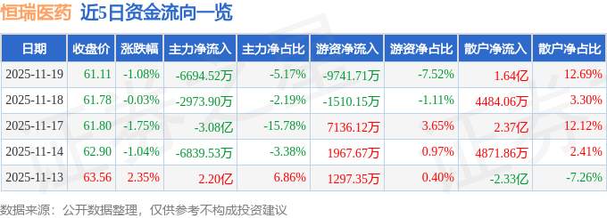 证券之星消息,截至2025年11月19日收盘,恒瑞医药(600276)报收于61.11元,下跌1.08%,换手率0.33%,成交量21.12万手,成交额12.95亿元。