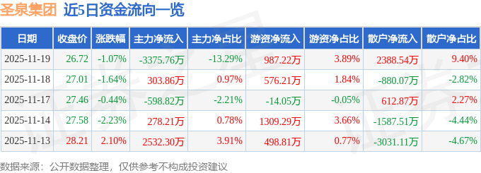证券之星消息,截至2025年11月19日收盘,圣泉集团(605589)报收于26.72元,下跌1.07%,换手率1.12%,成交量9.48万手,成交额2.54亿元。