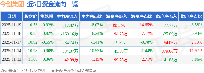 证券之星消息,截至2025年11月19日收盘,今创集团(603680)报收于10.73元,下跌0.92%,换手率0.32%,成交量2.52万手,成交额2699.92万元。
