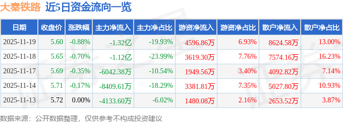证券之星消息,截至2025年11月19日收盘,大秦铁路(601006)报收于5.6元,下跌0.88%,换手率0.59%,成交量117.95万手,成交额6.63亿元。