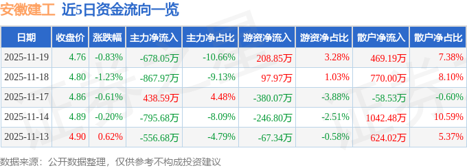 证券之星消息,截至2025年11月19日收盘,安徽建工(600502)报收于4.76元,下跌0.83%,换手率0.78%,成交量13.32万手,成交额6361.87万元。