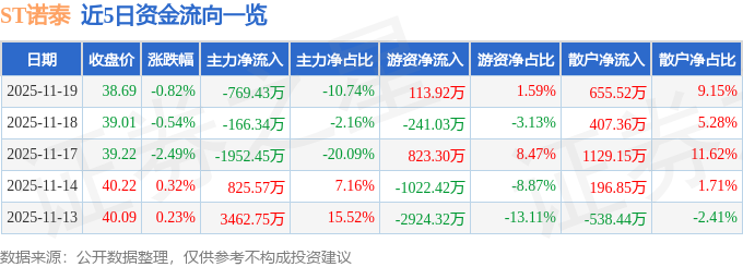 证券之星消息,截至2025年11月19日收盘,ST诺泰(688076)报收于38.69元,下跌0.82%,换手率0.58%,成交量1.85万手,成交额7161.66万元。