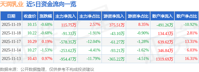 证券之星消息,截至2025年11月19日收盘,天润乳业(600419)报收于10.15元,下跌0.68%,换手率1.41%,成交量4.44万手,成交额4498.36万元。