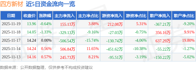 证券之星消息,截至2025年11月19日收盘,四方新材(605122)报收于13.96元,下跌0.64%,换手率1.66%,成交量2.86万手,成交额3993.4万元。