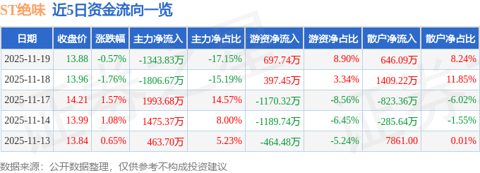 证券之星消息,截至2025年11月19日收盘,ST绝味(603517)报收于13.88元,下跌0.57%,换手率0.93%,成交量5.64万手,成交额7836.36万元。