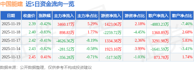 证券之星消息,截至2025年11月19日收盘,中国能建(601868)报收于2.39元,下跌0.42%,换手率0.84%,成交量273.55万手,成交额6.54亿元。