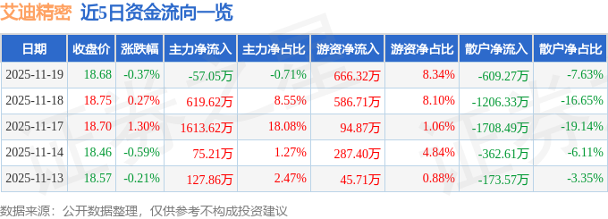 证券之星消息,截至2025年11月19日收盘,艾迪精密(603638)报收于18.68元,下跌0.37%,换手率0.51%,成交量4.26万手,成交额7989.18万元。
